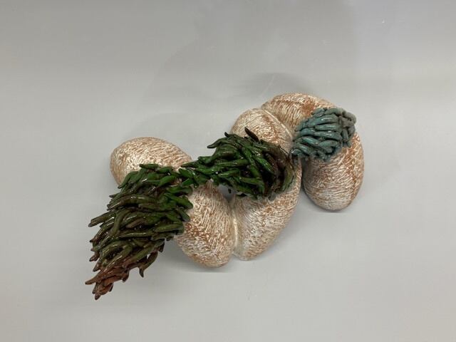 連なった塊の上に、紐状にした土を付け、重ねて、規則的に繰り返すことで、流れや方向性や、ある秩序が生まれてくる形。